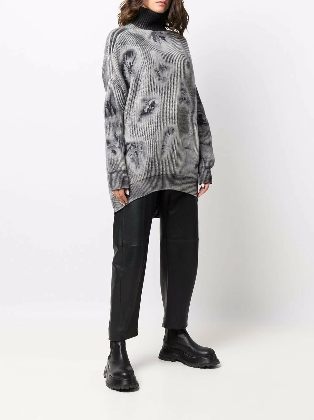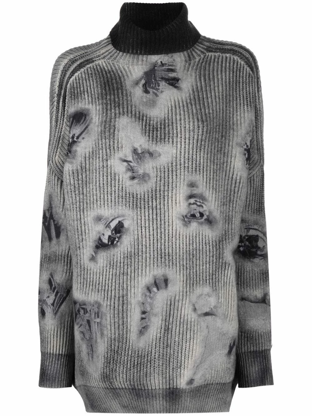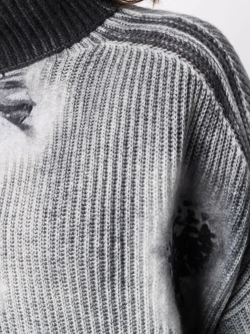 Maille épaisse nervurée, effet usé, col roulé, effet d’épaules descendues, manches longues.