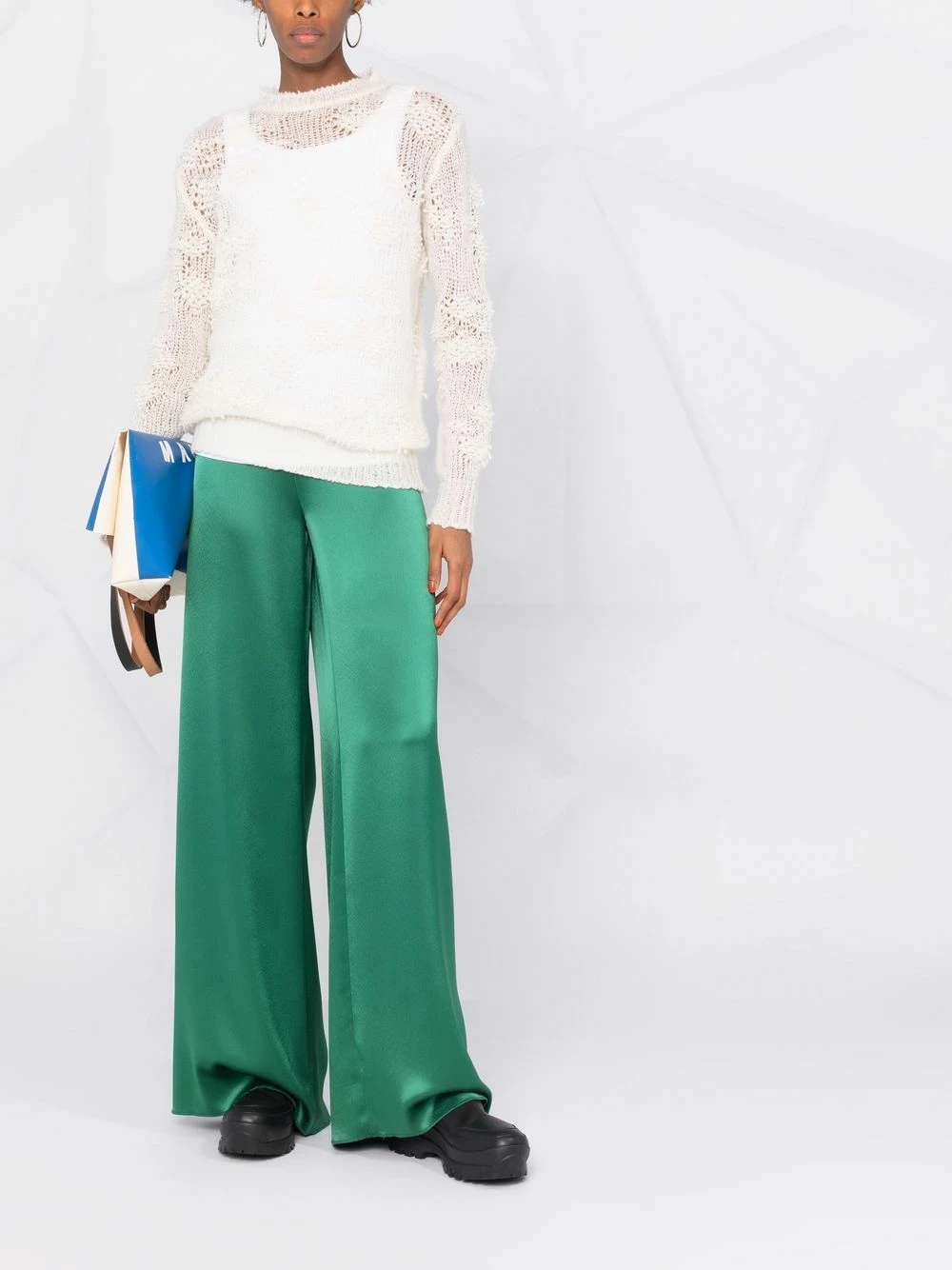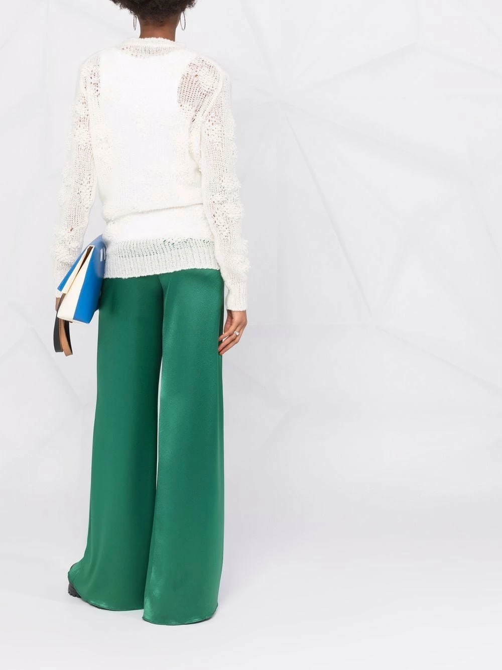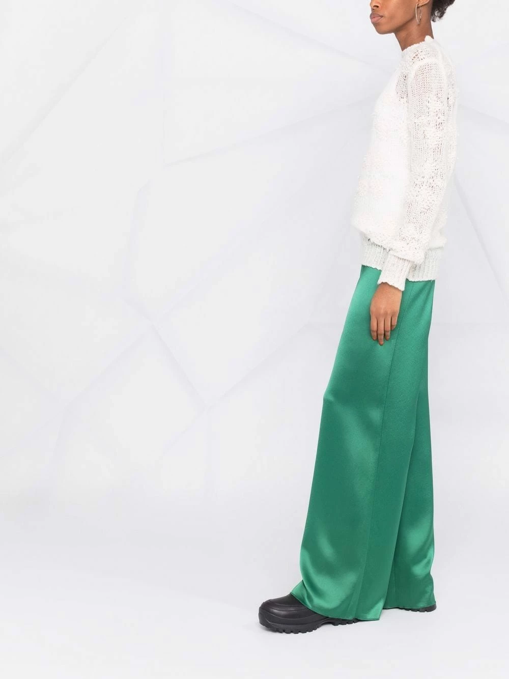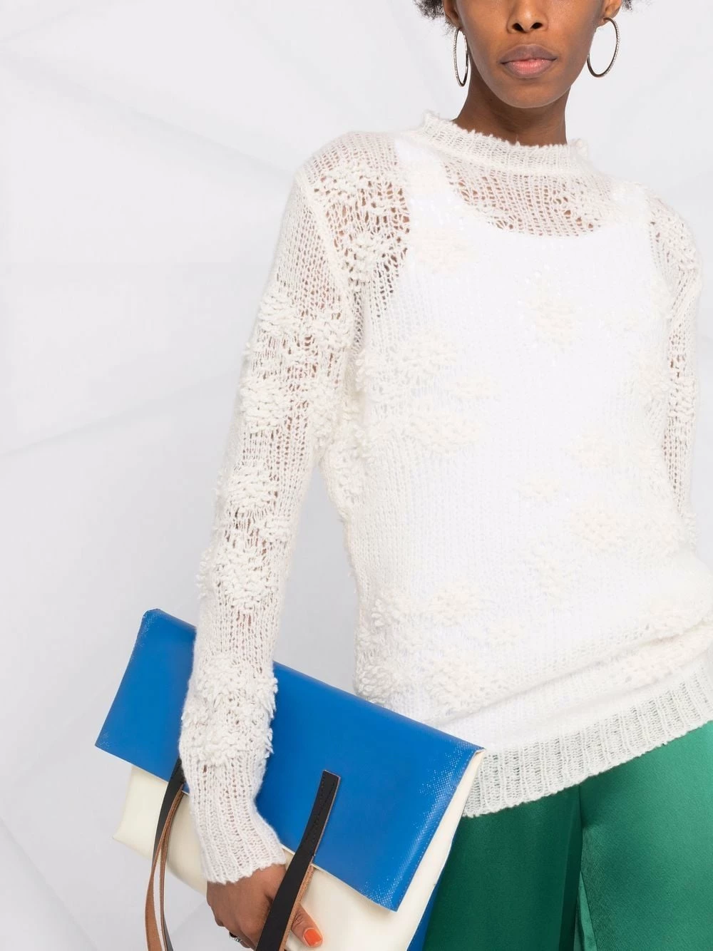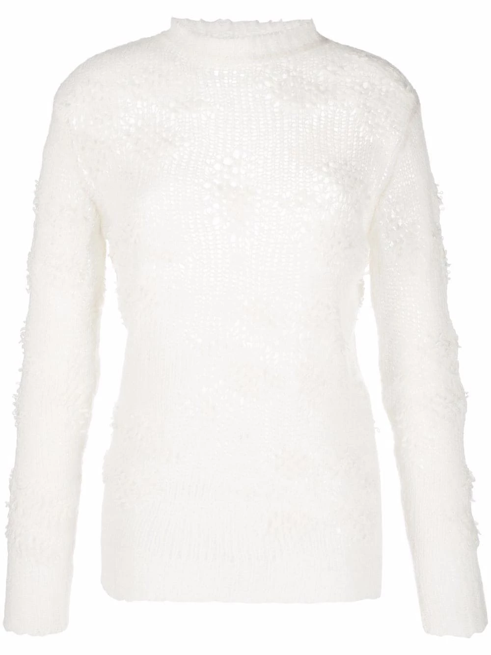 Blanc Cloud, cachemire, soie, maille ajourée, encolure ronde, manches longues.