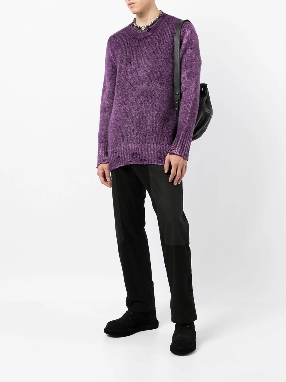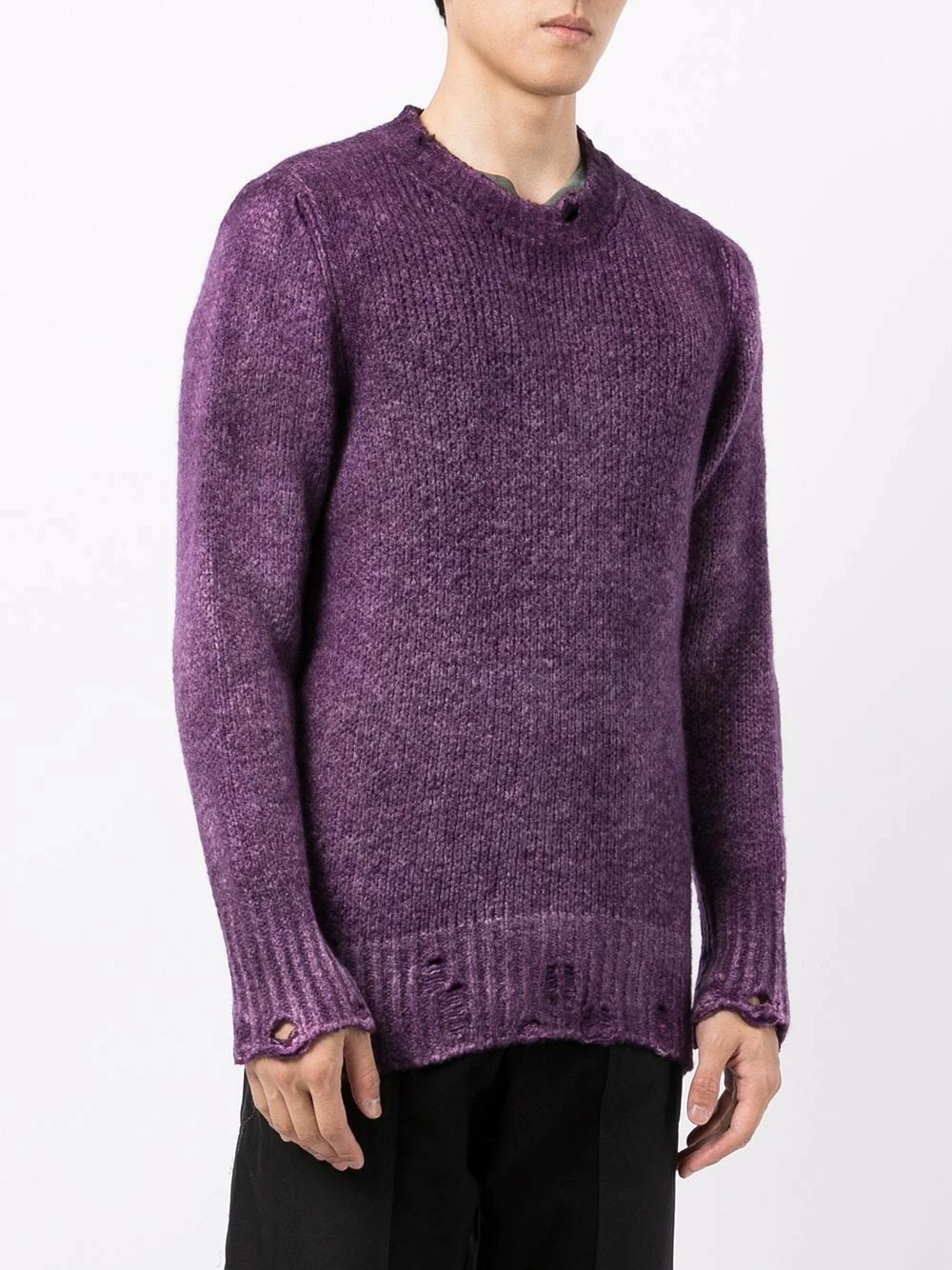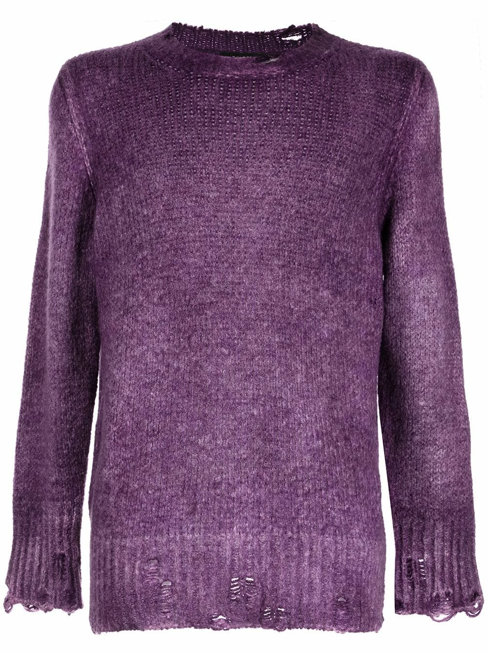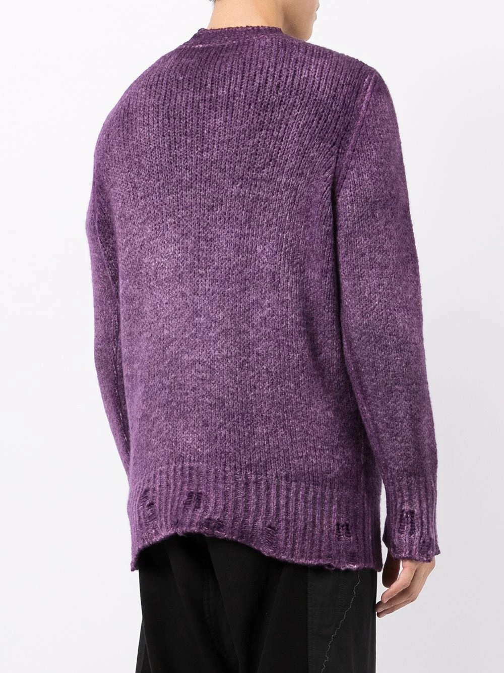 Encolure ronde, effet usé, manches longues, maille à l’envers, ourlet nervuré. Matière : cachemire.