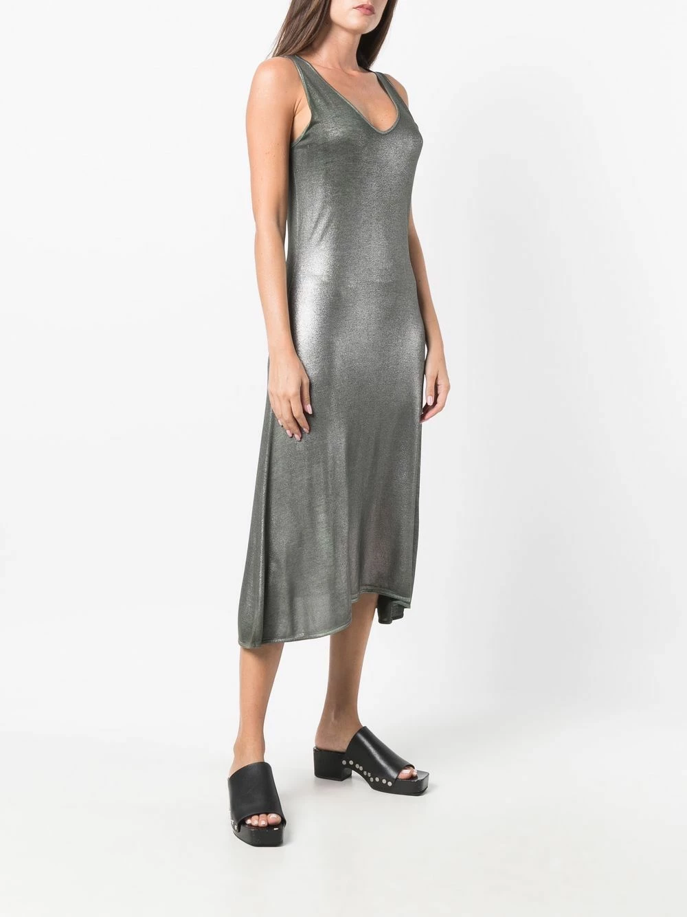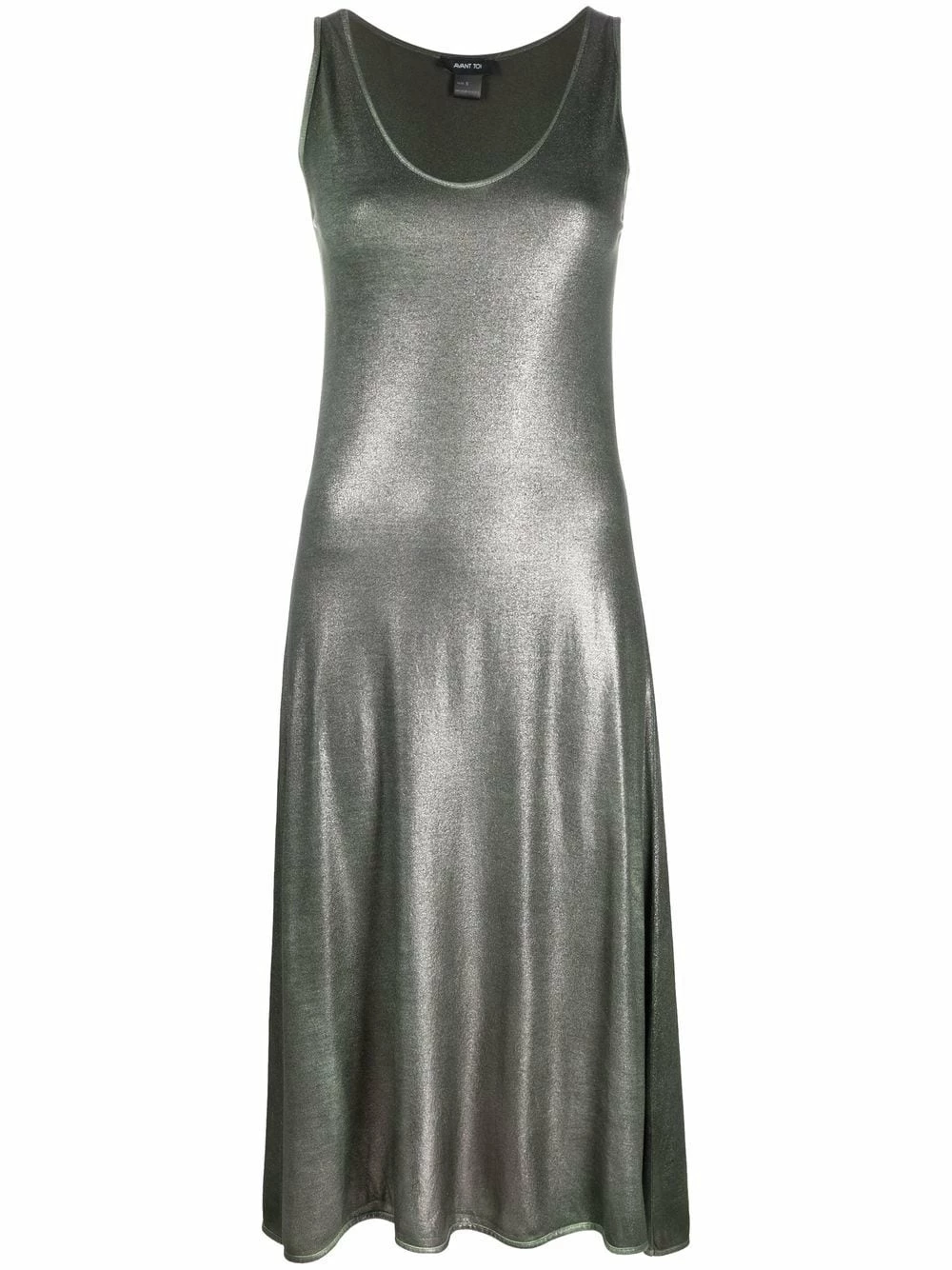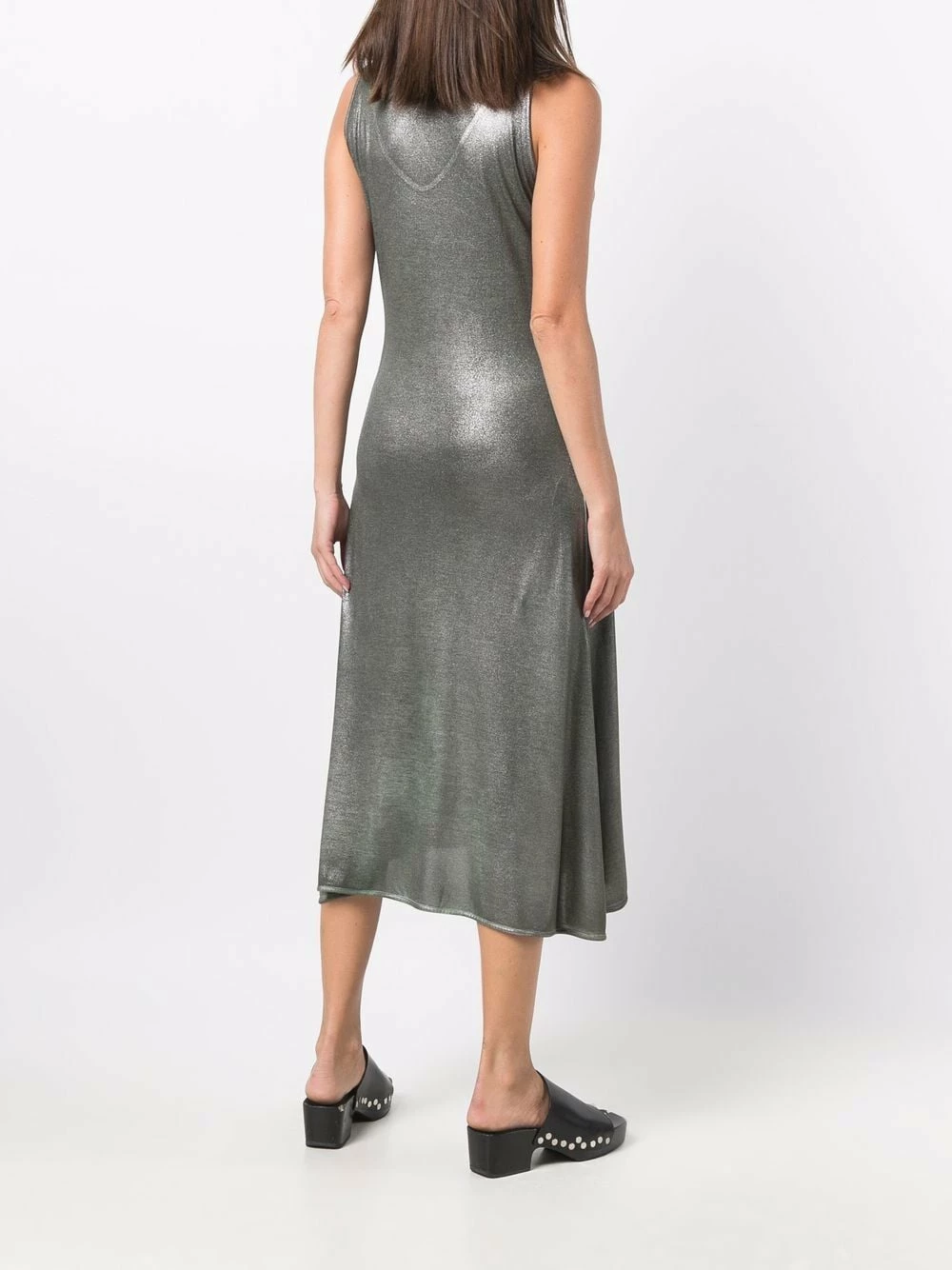 Fini métallisé, col v, design sans manches, jupe évasée. Couleur : gris.